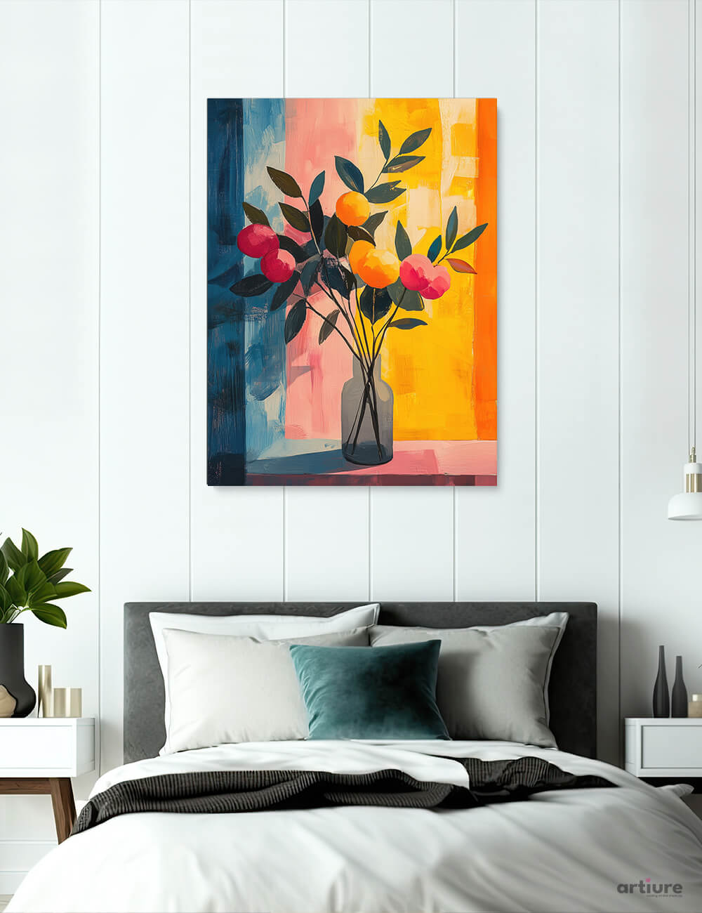 Vibrant Window Bouquet features a striking arrangement of round blossoms in warm oranges, reds, and pinks, set against an abstract background of color blocks. Painted in bold, textured strokes, it radiates energy and modern charm—perfect for brightening any living or work space.