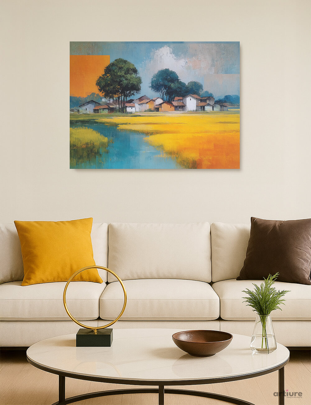 A luminous landscape canvas depicting a rural village bathed in summer light. Sturdy trees rise behind honey-toned fields that spill toward a tranquil river, while white-washed houses cluster along the horizon. The painterly brushwork blends azure skies with warm ochres and emerald greens, creating a mood of serene abundance. This canvas print invites contemplative viewing, echoing moments of peaceful rural life and the rhythm of seasonal change. Ideal for brightening living rooms, bedrooms, or entryways, it pairs well with mid-century furnishings and minimalist frames, offering a vibrant focal point without overpowering the room. Printed on canvas with a refined texture, the artwork balances bold color blocks with soft gradients, yielding a contemporary impression that feels both timeless and welcoming.