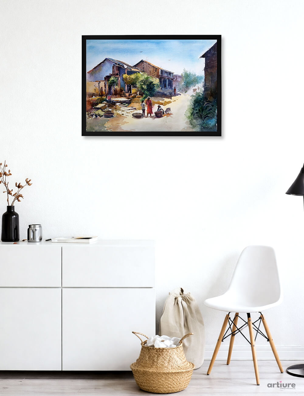 “Village Rhythms” beautifully captures the essence of rural life through soft watercolor strokes and warm, earthy hues. The scene reflects a harmonious village setting where everyday activities unfold naturally—women engaged in chores, animals roaming freely, and sunlight illuminating rustic homes. The artwork evokes nostalgia and simplicity, portraying a lifestyle deeply connected to nature and community. The fluidity of watercolor enhances the calm and organic movement within the composition, making the viewer feel immersed in the environment. This piece celebrates the beauty of slow living, cultural roots, and the quiet, enduring rhythm that defines life beyond the city.