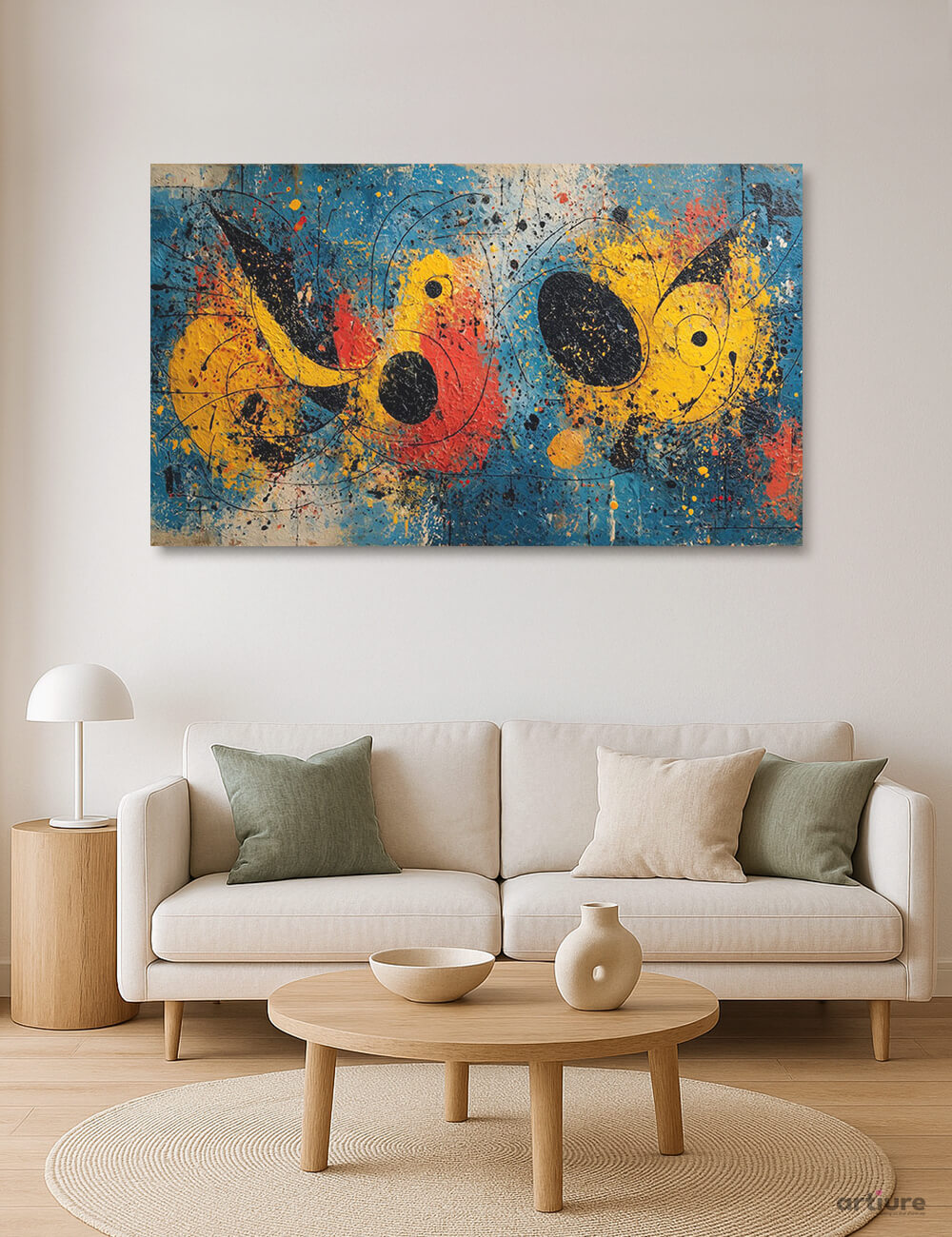 An electric abstract canvas print that commands attention with splashes of cobalt blue and radiant yellows, tempered by bold black gestures. The composition unfolds in layered circles and sweeping drips, creating a kinetic dialogue across a 16:9 format. This piece brings contemporary energy to any living room, becoming a dynamic focal point above a sofa or in a bright hallway. Its tactile textures echo classic abstract expressionism while its vibrant palette feels perfectly at home in modern interiors. Printed on canvas to preserve depth and intensity, the artwork invites viewers to wander through color and motion, leaving a lasting impression of spontaneity and refined style.
