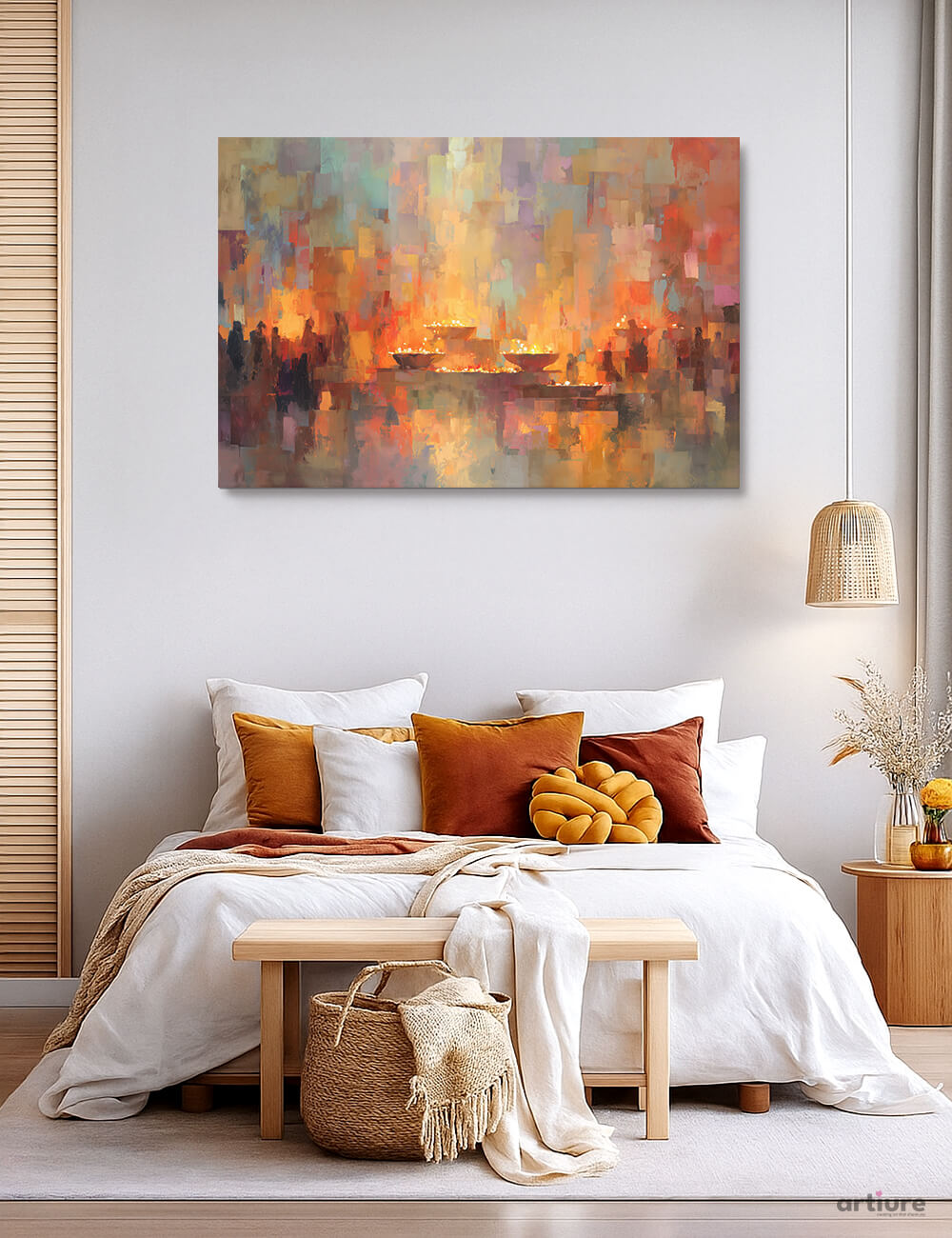 An electric mosaic of color unfurls across the canvas, blending burnt oranges, sunlit yellows, pinks and purples into a radiant skyline of light. Abstract blocks melt into soft edges, suggesting distant boats and a harbor glow while painterly brushwork preserves a vivid, tactile texture. The composition radiates warmth yet remains harmonious, making it a versatile focal point for bedrooms and living spaces that crave contemporary energy without overwhelming calm. Printed on high-quality canvas, the piece preserves depth and luminous tonal shifts that respond to varying light throughout the day. Paired with neutral textiles and warm wood accents, it reinforces a premium, inviting mood ideal for modern interiors.