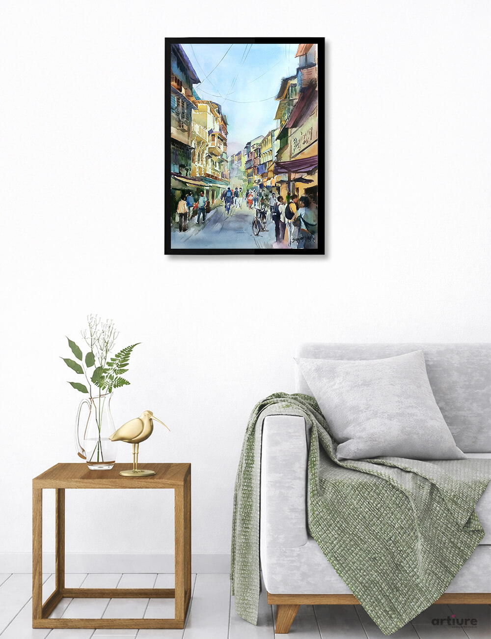 “Walk Through The Crowd” beautifully portrays the rhythm of everyday urban life through a bustling street filled with people, bicycles, and layered architecture. The watercolor medium adds a soft fluidity, blending colors to evoke movement, warmth, and spontaneity. Buildings on both sides guide the viewer’s eye toward the lively crowd, creating depth and perspective. Subtle details like shop signs, hanging wires, and shifting shadows bring authenticity to the scene. The artwork captures not just a place, but a feeling—the shared energy of human presence. It reflects the beauty of ordinary moments, where stories unfold quietly within the flow of daily life.