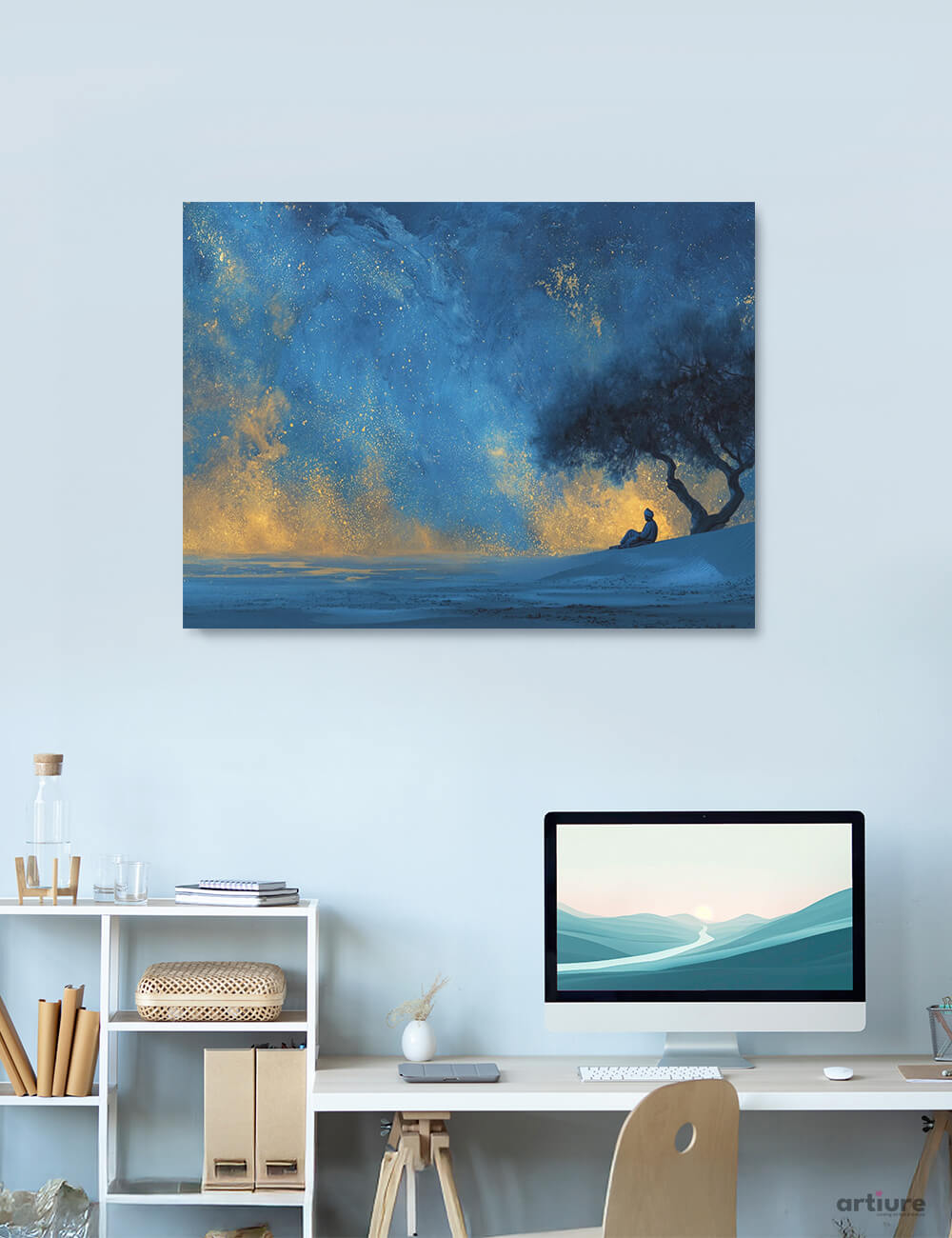 This breathtaking canvas captures the climactic moment of cosmic communion. A solitary seeker reclines beneath the sheltering tree, as the sky unfurls into a radiant storm of starlight and fire. Shades of indigo and cobalt merge with golden bursts, creating the impression of both creation and dissolution. It is the universe speaking back — a reminder that in the deepest solitude, one becomes part of something infinite. A finale to the Solitude & Stars series, it symbolizes transcendence, illumination, and the return of silence after revelation.