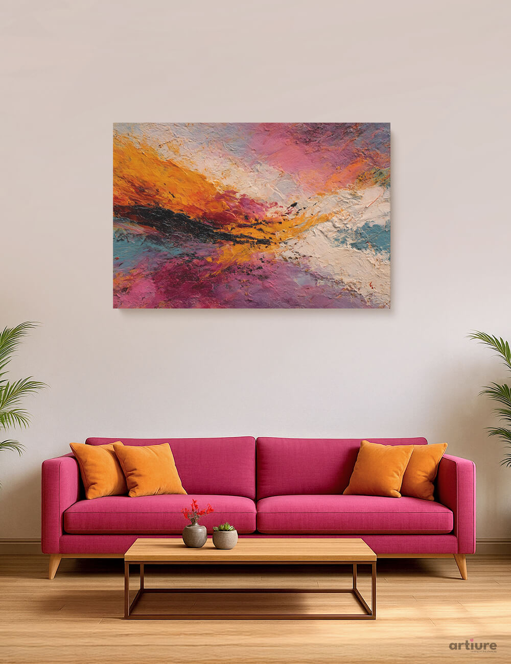 This vivid abstract work captures the volatile beauty of a restless twilight. With bold textures and impassioned strokes of magenta, orange, black, and teal, When the Sky Forgot to Sleep embodies energy, chaos, and harmony all at once. A visual symphony for the free-spirited and the seekers of meaning in madness.