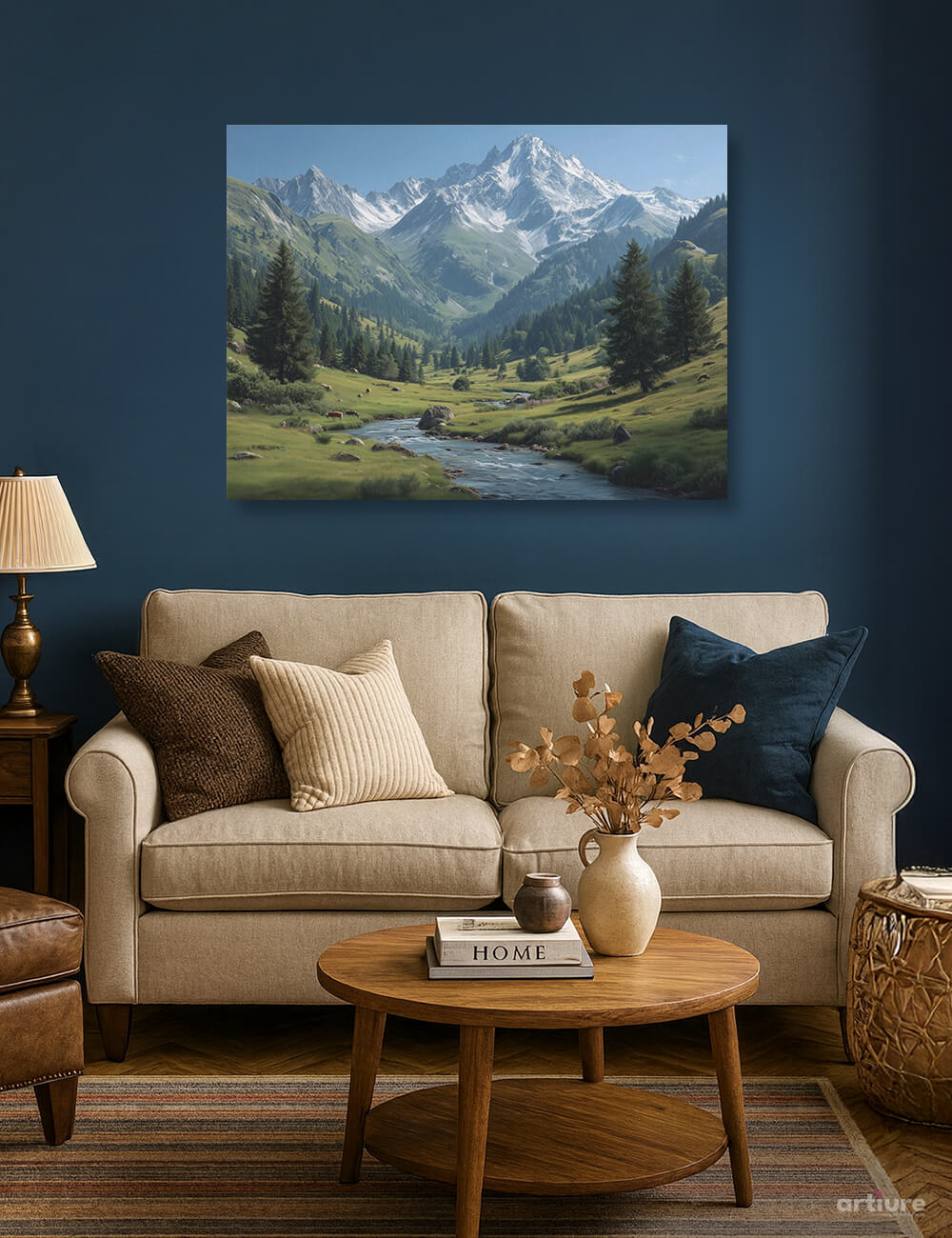 This canvas captures the breathtaking beauty of an alpine paradise — towering snow-draped peaks standing guard over rolling green meadows and a crystalline stream winding its way through tall pines. Cows graze peacefully in the valley, adding a pastoral charm to the grandeur of the landscape. The painting balances tranquility and majesty, making it ideal for those seeking a touch of calm wilderness in their living space.