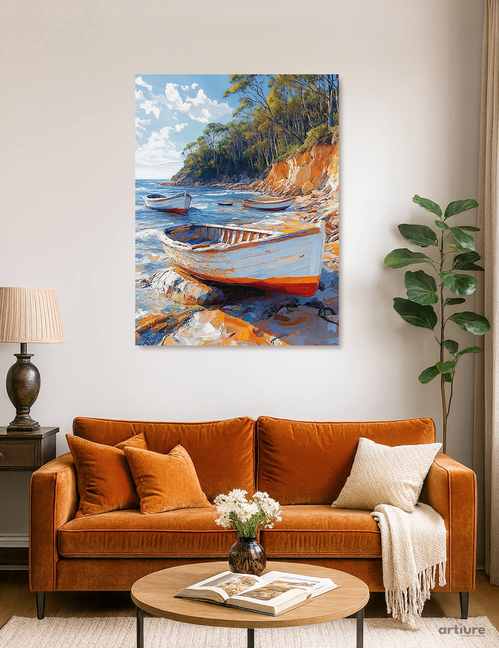 An energizing coastal scene rendered in expressive brushwork and saturated color. This canvas print captures a small flotilla of boats moored along a sunlit shoreline, where turquoise sea meets orange clay cliffs and a sky brushed in azure and white. The thick impasto textures and bold color blocks create a tactile sense of movement, inviting the viewer to step into the seaside moment. Perfect above a sofa or in a bright corner, it pairs well with warm woods and neutral textiles while adding a spirited pop of color. The piece reads as both contemporary and timeless, a reminder of carefree afternoons by the water.