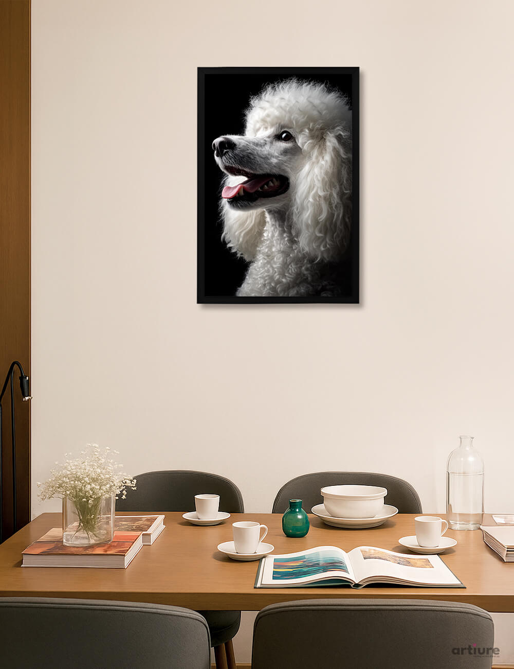 An elegant framed portrait of a white poodle gazing upward, set against a deep black backdrop. The image highlights the plush curls and bright eyes with lifelike detail, creating a striking contrast that anchors a contemporary dining space. Surrounded by a warm beige wall and a clean wooden table scene, the piece pairs a minimalist frame with everyday hospitality—coffee cups, books, and a vase—to evoke homely sophistication. The artwork blends playfulness with refined decor, appealing to pet lovers and art enthusiasts alike. Rendered as an print, it offers bold presence without overwhelming the room, making it a versatile focal point for living rooms, hallways, or dining areas.