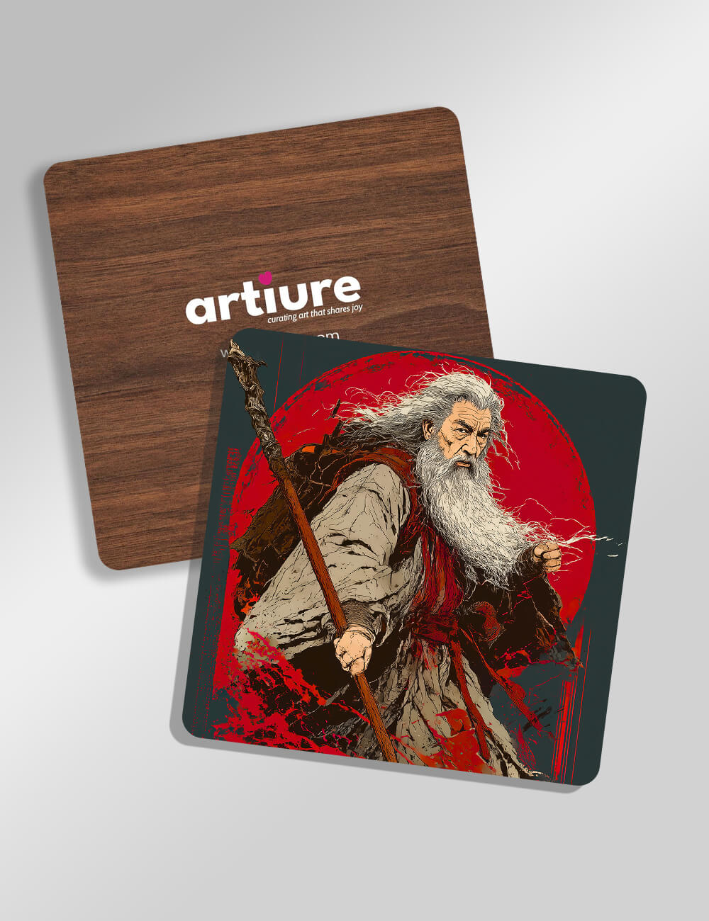 Vivid fantasy illustration graces this kitchen coaster, featuring a weathered wizard with a long white beard and staff, set against a bold crimson halo. The artwork blends rich browns and teal accents, echoing natural wood textures on the coaster back, while the front showcases dynamic linework and dramatic shading that captures a moment of ancient magic. Sized for practical use in dining or coffee corners, this coaster adds a narrative focal point to contemporary or rustic tables. Ideal for gifting fans of mythic art, fantasy epics, or whimsical home accents. Printed as a digital illustration inspired by classic mythic aesthetics, ready to brighten kitchen counters and dining spaces.