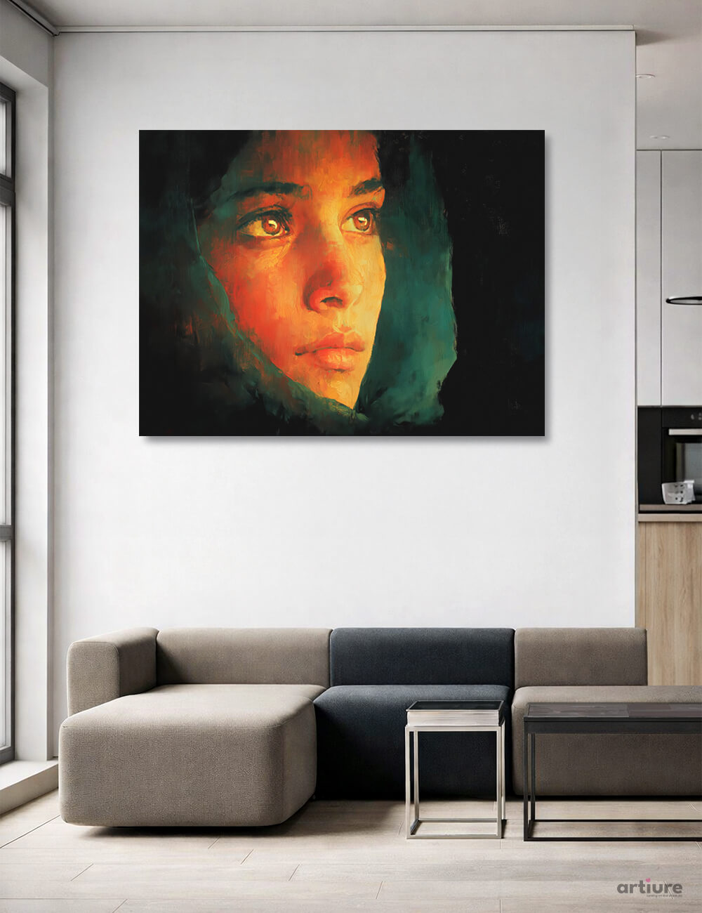 This canvas print captures a luminous, enigmatic portrait where warm orange tones meet cool teal shadows. The subject’s eyes, luminous and alert, emerge from a veil of painterly texture that blurs the boundary between figure and atmosphere. The brushwork suggests a dreamlike immediacy: sweeping strokes of color carve a face from darkness, while deliberate contrasts reveal inner resolve. The composition centers the face against a enveloping void, inviting the viewer to step closer and read the emotion in the gaze. Ideal for contemporary living spaces seeking a bold yet intimate focal point, this piece pairs rugged texture with a refined color story that shifts with light throughout the day.