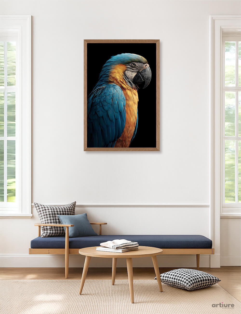 This fine art print captures the blue-and-yellow macaw in a striking side-profile, celebrating contrast, color, and confidence. Brilliant blue wings cascade into rich golden-yellow plumage, while the strong curved beak and alert eye reflect intelligence and strength. Set against a deep black background, feather textures appear sculptural and luminous, creating a contemporary, gallery-quality portrait. Native to lush rainforests, the macaw symbolizes freedom, communication, and vitality. Ideal for modern interiors, creative studios, and statement walls, this artwork brings bold tropical energy without overwhelming the space—transforming a moment of avian beauty into a timeless expression of elegance, character, and wild presence.