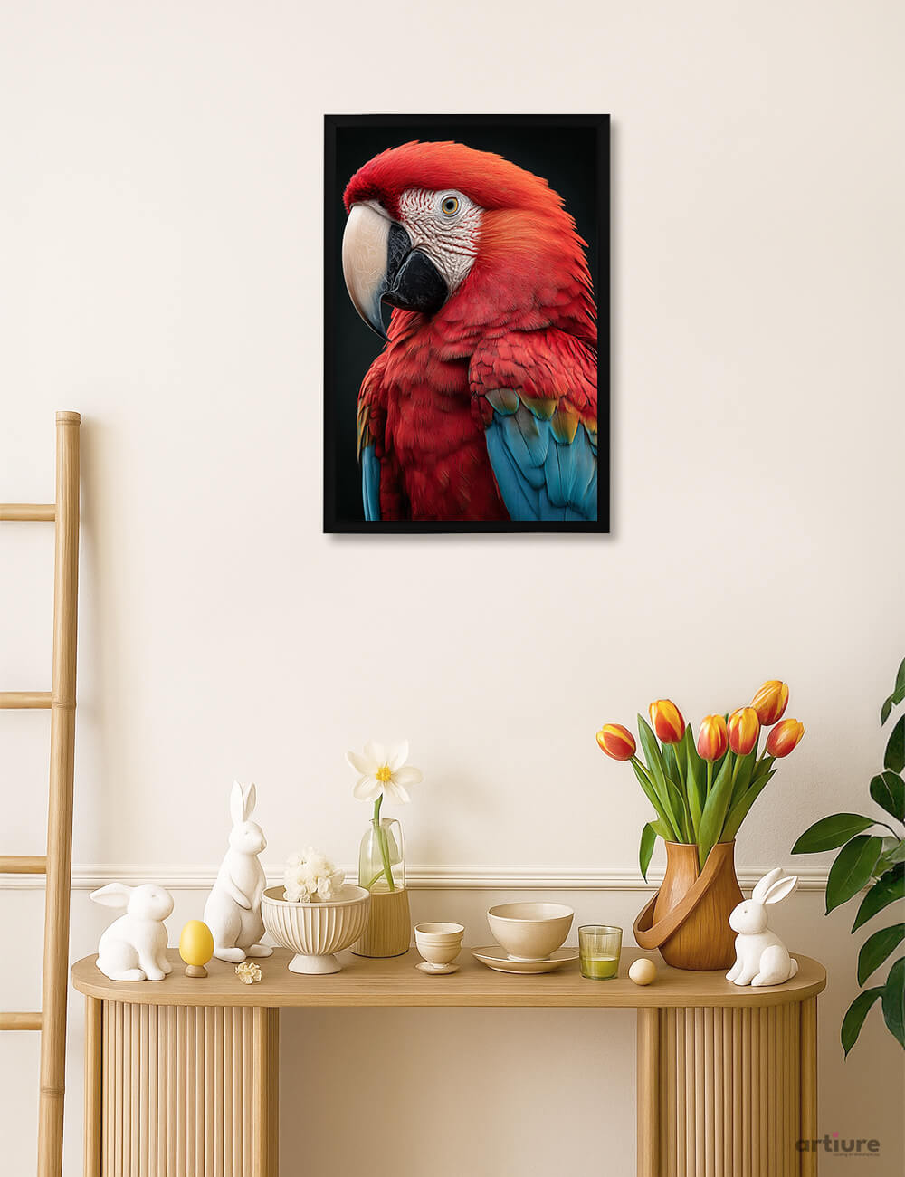 This fine art print captures the scarlet macaw in a vivid side-profile, celebrating one of nature’s most colorful and expressive birds. Brilliant red plumage dominates the composition, complemented by rich blue and golden accents along the wings. The powerful curved beak and alert eye convey intelligence, strength, and charisma. Set against a dark background, every feather appears luminous and sculptural, enhancing contrast and depth. Native to tropical rainforests, the scarlet macaw symbolizes freedom, communication, and exuberant life. Ideal for modern interiors, creative studios, and statement walls, this artwork brings energy and exotic elegance into any space, transforming tropical wildlife into a timeless visual celebration of color and presence.