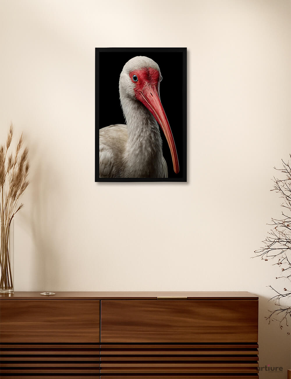 This fine art print features the white ibis, captured in a dramatic studio style that highlights its ivory feathers, vivid red facial skin, and gracefully curved bill. Emerging from a deep black background, the bird’s calm expression and poised posture create a powerful sense of balance and dignity. Subtle textures and soft lighting reveal every feather with clarity, making the portrait feel intimate and contemporary. Ideal for modern homes, offices, or galleries, this artwork evokes wetlands, quiet mornings, and coastal landscapes. It celebrates elegance found in nature, transforming wildlife photography into a timeless, collectible statement piece for thoughtful interior spaces.